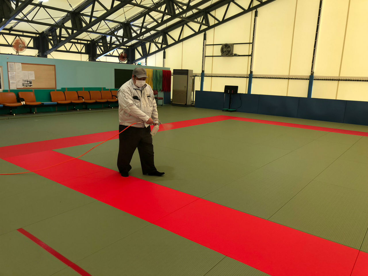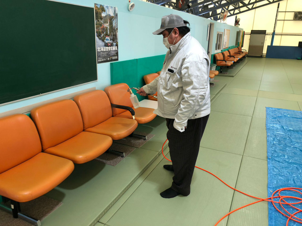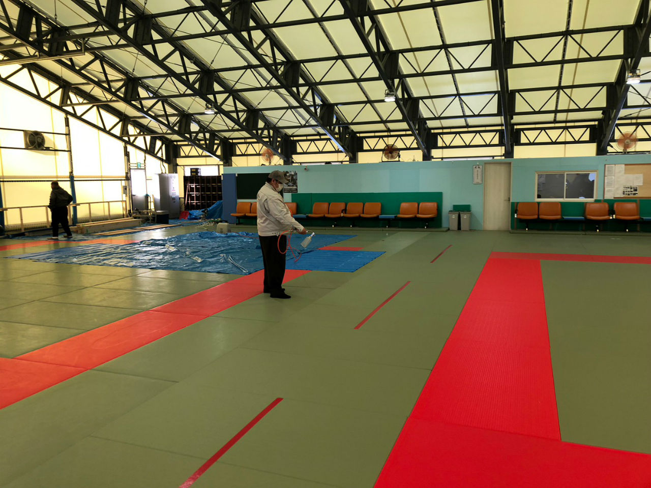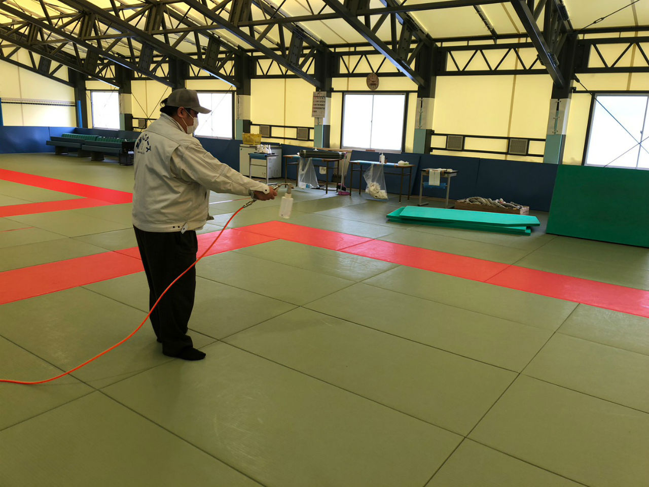 施工例:1/11 札幌大学様柔道場 噴霧作業