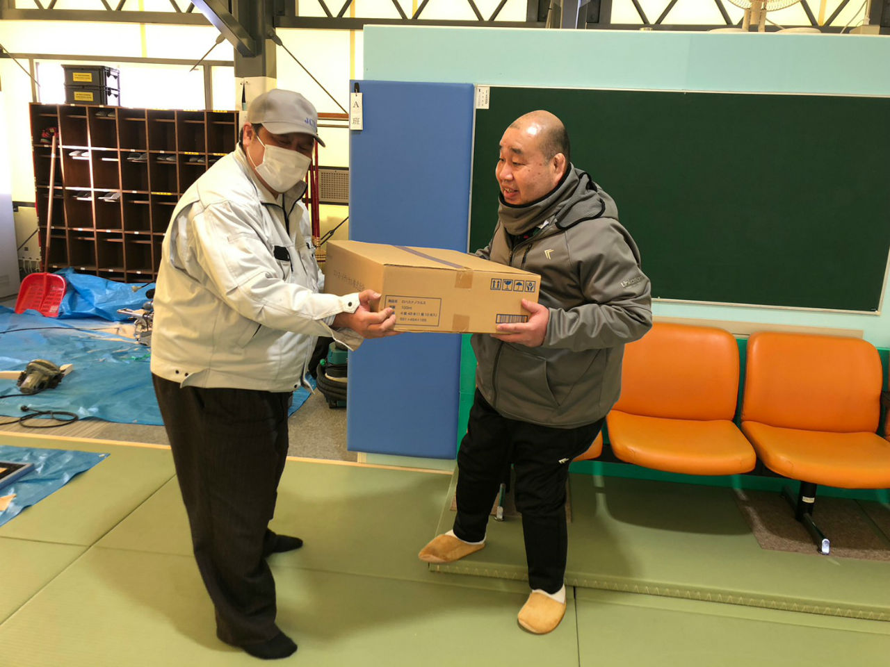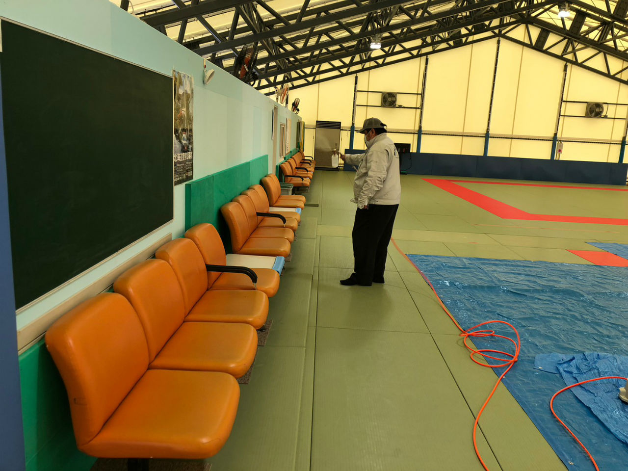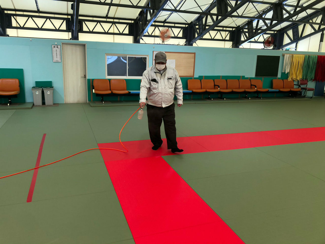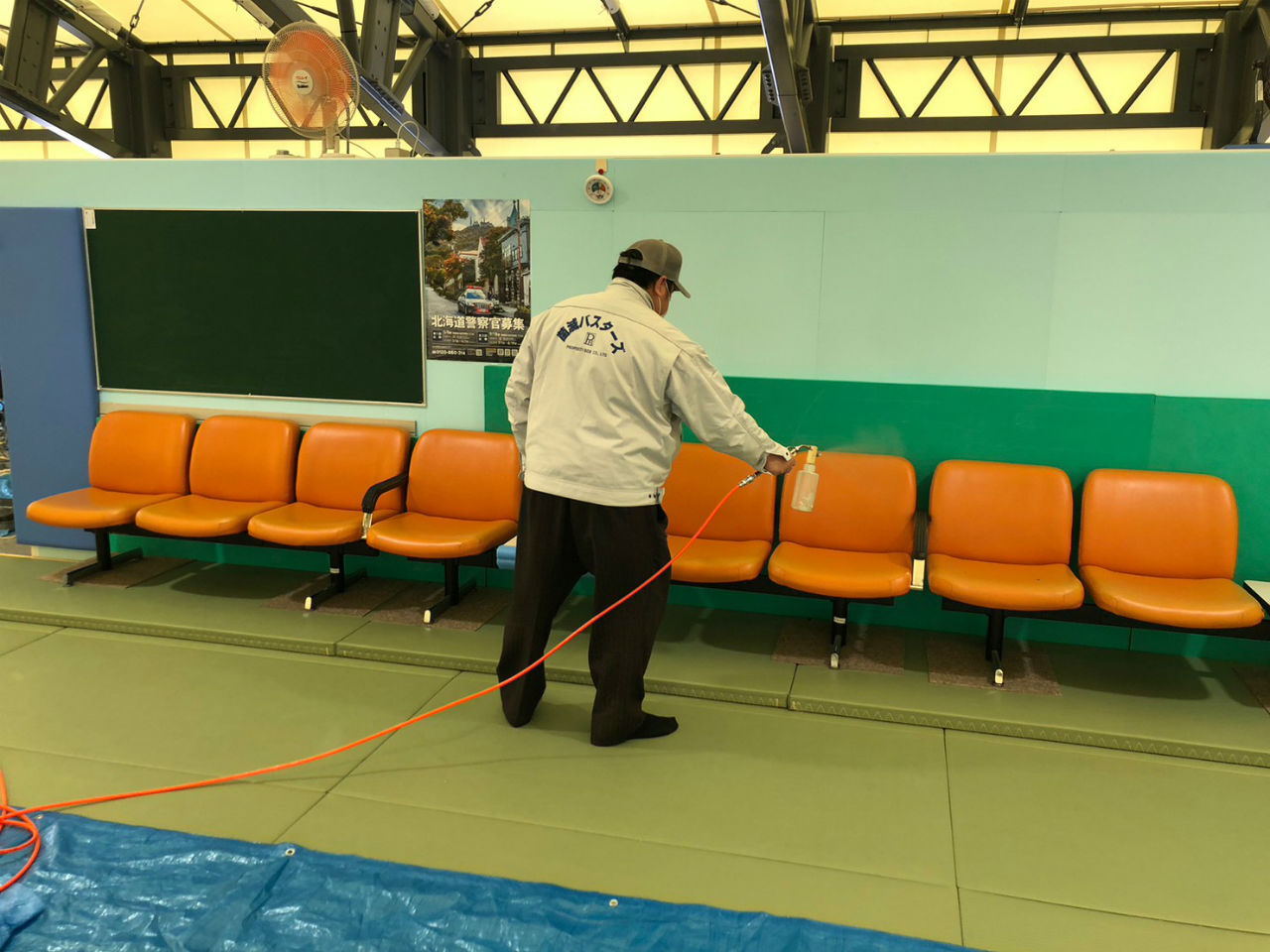 施工例:1/11 札幌大学様柔道場 噴霧作業